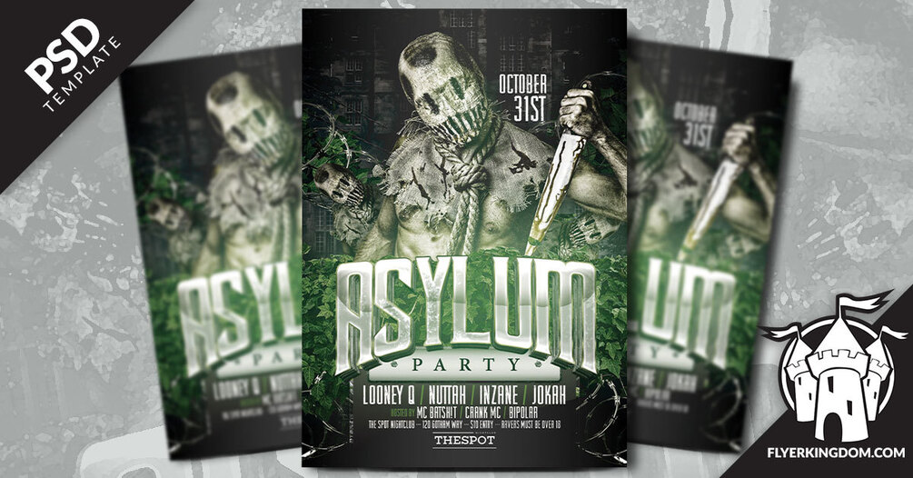 Insane Asylum Party Flyer Template, easily editable for your party or event. Perfect flyer design to set the mood this holiday and as always this is an Exclusive Photoshop PSD.